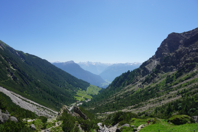 Bestens gestärkt geht es somit ins Geröll. Moment, wir wollen doch klettern!? Aber das alpine Klettern besteht natürlich nicht nur aus Klettern bei schönstem Panorama und „aus dem Auto heraus sichern“ (O-Ton Ronny), sondern Zu- und Abstieg von den Kletterrouten müssen ebenfalls eingeplant, bewältigt und gekonnt sein. Also steht als letzter Programmpunkt für den Tag, Gehen im weglosen Gelände an. Somit suchen wir uns unseren Weg, setzen bedacht und leise unsere Füße (hat etwas Meditatives), und suchen uns unseren Weg durchs Geröll, dabei übernimmt immer einer von uns die Führung. Oben angekommen, müssen wir natürlich durch ebenso wegloses Geröll wieder hinunter. In der Feinform sollte das Surfen im Geröll werden, es ähnelt wohl eher der Grobform – aber zu unserer Verteidigung, es ist auch wirklich kein schönes Geröllfeld. Gut unten angekommen, leicht eingestaubt und mit Geröll in den Schuhen, müssen wir jedoch einen Sprint hinlegen, denn Abendessen gibt es um Punkt 18 Uhr und da wollen wir auf keinen Fall Gefahr laufen, dass wir das köstliche Essen verpassen – wir waren mittags noch von dem Kellner vorgewarnt worden, dass wir um 18:05 Uhr nichts mehr bekommen… Aber Punkt 18:05 Uhr sind die ersten von uns da und wir haben Glück, wir werden wieder mit hervorragendem Essen verwöhnt.