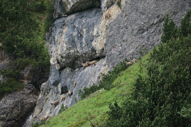 Gämse erklimmen leichtfüßig den Wasserfall-Klettersteig bei der Muttekopfhütte.