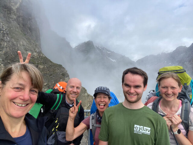 Aber jetzt mal von vorne… Grundkurs Alpinklettern, 25.06. – 30.06.2023, die Vorfreude ist riesig und am Samstag machen sich Ronny, Sabine und Heike in Fahrgemeinschaft auf den Weg von Aachen nach Imst. Schon hier beginnt das volle Service-Paket, Ronny fährt uns sicher Richtung Berge, Sabine unterstützt als Beifahrerin und Heike… ja sie macht es sich hinten gemütlich und verschläft einen guten Teil der Fahrt. Schon hier zeigt sich also, wir fühlen uns pudelwohl und die erste gemeinsame Tour verläuft harmonisch. Wir sind mit einem Tag Puffer angereist, lassen den Urlaub schon bei Pizza und Bierchen beginnen und verbringen eine Nacht in der Nähe von Imst in einem Hostel, um am nächsten Tag frisch in die Berge zu starten. Astrid und Julian, unsere beiden Tourenleiter sind bereits ein paar Tage vorher auf die Muttekopfhütte angereist und erkunden schon die Umgebung. Es kann also losgehen, Sonntag, 25.06.2023, treffen wir uns zum Abendessen auf der Hütte. Hier zeigt sich schnell, wir werden eine Woche lang kulinarisch hervorragend verwöhnt werden und die Gruppendynamik stimmt ebenfalls.