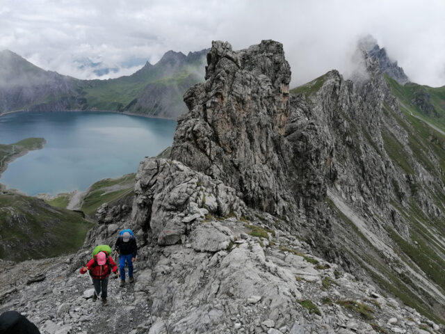 Auf dem Latschätzer Höhenweg weiter, wo uns ein entgegenkommender Alphornbläser ein spontanes Ständchen bringt, zur Oberen Alpe Latschätz, an der es noch einmal ein Kaltgetränk gibt. Sanft abfallend folgen wir der Gaunertaler Alpkul Tour bis zur Lindauer Hütte, an der wir es uns nach einer warmen Dusche auf der großzügigen Terrasse gemütlich machen. Wir genießen den wundervollen Blick auf die „drei Türme“. Das Lernen eines neuen Kartenspiels und eine hitzige Diskussion darüber, wie viele Teebeutel in eine Kanne mit heißem Wasser müssen, sorgen für allgemeine Heiterkeit.