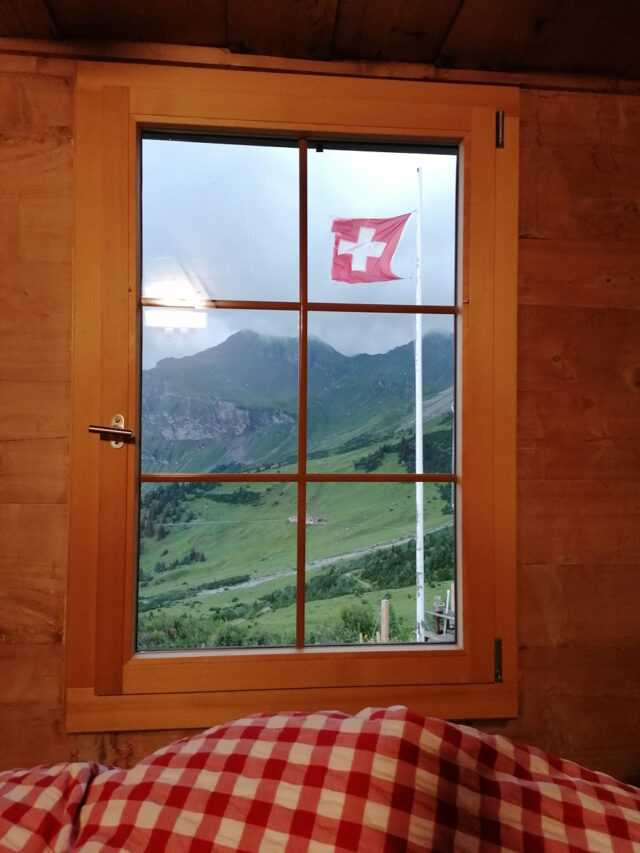 Der erste Blick morgens aus dem wunderschönen Doppelzimmer, an der Schweizer Flagge vorm Fenster vorbei auf die Bergspitzen, zeigt: Neuschnee. Wir ziehen uns mehrere Schichten Kleidung an und machen uns wieder pünktlich um 8.00 Uhr auf den Weg. 17 km liegen vor uns mit 2 größeren Anstiegen. Aber erst einmal gemütlich den Rätikon-Höhenweg-Süd zurück bis zu der Stelle, an der wir von der Gamsluggen gestern abgestiegen sind. Der matschige Bergwanderweg führt an der österreichischen Grenze entlang. Die Blumenfelder sind mit einer Schicht „Puderzucker” bedeckt. An dem Gafalljoch finden wir das erste Grenzschild und blicken noch einmal auf den Lünersee. Der Höhenweg ist wunderschön, leider wird der Nebel immer dichter. Während des steilen Abstiegs begegnen wir zwei Wanderern, die uns ankündigen, dass die Carschinahütte kein warmes Wasser hat. Na gut, dann heute nochmal Katzenwäsche. Wir gönnen uns eine Pause, bevor der Weg wieder hochgeht. Bereits in der Carschinahütte stopfen wir Zeitungspapiere in unsere Bergschuhe und suchen ein Plätzchen, an dem wir unsere nasse Regenkleidung trocknen können, z.B. im Flur hinter dem Kamin der Stube. Danach gibt es nichts Besseres als ein Stück Kuchen und einen heißen Kakao, um sich aufzuwärmen. Kurz vor dem Schlafengehen kommt in unserem 8er Zimmer ausgelassene Klassenfahrtsstimmung auf.