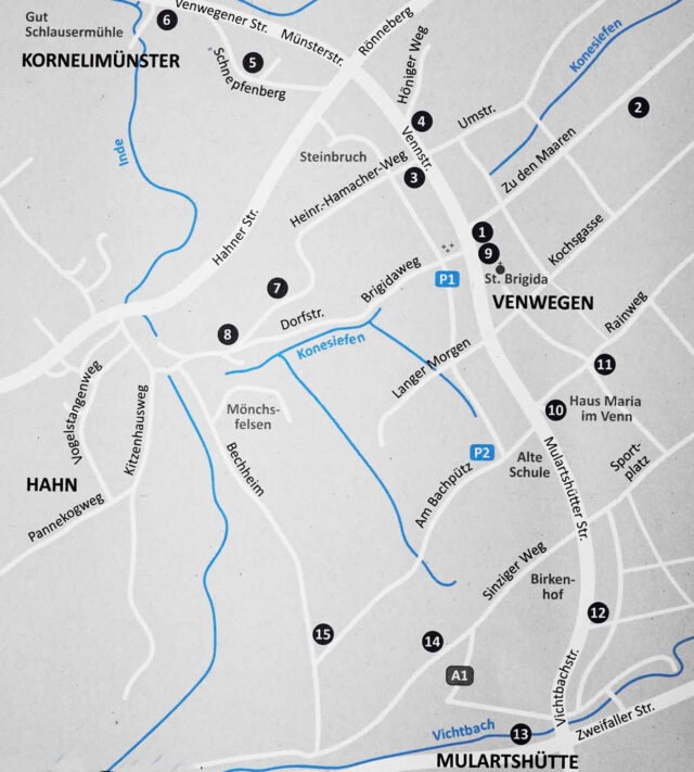 Im landschaftlichen Dreieck der Orte Venwegen, Hahn und Kornelimünster haben Schülerinnen und Schüler des Berufskollegs für Gestaltung und Technik der Städteregion Aachen in Zusammenarbeit mit einer Gruppe der Gemeinschaft der Gemeinden (GdG) Aachen, Kornelimünster und Roetgen 15 alte Bildstöcke und Wegkreuze als Markierung für einen Pilger- und Wanderweg ausgewählt und zum Teil neu gestaltet.