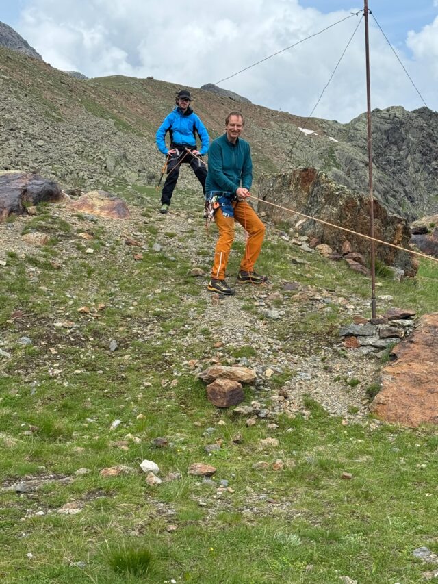 Der folgende Tag, unser zweiter Regenerationstag, führte uns durch das bachdurchflutete Zwischental zur Pizzinihütte (2706 m). Der Weg ging durch herrliche Wildwiesen. Dabei brachte uns Lydia ein paar essbare Wildkräuter näher. Derart gestärkt und angeregt, erklärte uns Dominik auf über 2500 m Meereshöhe, also auf recht hohem Niveau, die Laplace-Transformation. Wer diese nicht kennt, sollte dringend unter https://de.wikipedia.org/wiki/... nachschauen. Auf diese Weise aufgeschlaut, kamen wir bereits mittags an der Pizzinihütte an, wo Peter zu seinem Schrecken feststellen musste, dass er seine Softshelljacke in der Branca-Hütte vergessen hatte. Also jeweils 2,5 Stunden hin- und zurück? Nein, weit gefehlt, denn Lydia zauberte direkt eine neue und passgenaue Jacke aus ihrem Rucksack, über die sich Peter wiederum sichtbar freute. Mit Laplace-Transformation und neuer Jacke war die Gruppe aber bei weitem nicht ausgelastet und so ging es nach Kaffee und Kuchen nochmal auf den Gran-Zebru-Gletscher Richtung Königsjoch. Den Nachmittag schlossen wir mit Bergrettungsübungen ab.