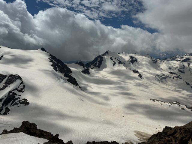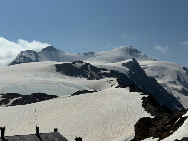 Nun brach schon der vorletzte Tag an und bei guter Wettervorhersage hatten wir uns gleich zwei Riesen der Ortleralpen vorgenommen. Bereits um 4 Uhr morgens ging es mit Stirnlampe erst zum Langenfernerjoch, dann über die Aufstiegroute zum Cevedale (3769 m), einem majestätischen Berg, der weit in den Vinschgau hinein sichtbar ist. Ursprünglich wollten wir von der Casatihütte starten, was uns über 500 Höhenmeter gespart hätte. Da diese aber wegen Einsturzgefahr seit dieser Saison geschlossen ist, starteten wir eben bei bester Laune weiter unten . Bei Peter (und auch den anderen) überhaupt kein Problem, da er ja durch seine neue Jacke besonders beflügelt war und damit auch die kühlen Temperaturen mühelos wegstecken konnte. Dafür glitzerte der Schnee im Stirnlampenlicht wie ein riesiges Diamantfeld und es wurde ein unvergesslich schöner Aufstieg. Schon vor 9 Uhr erreichten wir den Gipfel des Cevedale, der uns eine herrliche Aussicht auf die umliegende Gletscherlandschaft bot. Hochmotiviert machten wir uns gleich zum nächsten Gipfel auf, der in direkter Nachbarschaft gelegenen Zufallsspitze (3757 m). Obwohl beide Gipfel nur rund 45 Minuten trennen und sie durch einen schönen schneebedeckten Grat verbunden sind, war es dort vorbei mit der schönen Sicht. Die umliegenden Berge waren verschwunden und selbst der Cevedale war im Nebel nicht mehr zu sehen. Im Abstieg ging es glücklich und voller Freude zurück zur Pizzinihütte, wo wir ein letztes Mal einen gemeinsamen Abend verbringen durften. Marcel hat es sich nicht nehmen lassen, beim Abendessen erneut einen veganen Hüttenkalorienrekord aufzustellen. Viel Muskelmasse muss halt auch erhalten werden.