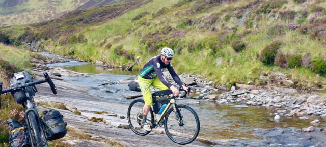 Endlich geht es bergauf und nach einer kurzen Pause bei einem recht bekannten alten Gemäuer geht es endlich in die Berge. Meditativ kurbeln wir uns das lange Tal bergan, glücklicherweise haben wir einen leichten Gegenwind, sodass uns die Midgies nicht allzu sehr nerven, die sollten später noch auf ihre Kosten kommen. Nach dem Pass kommen wir auf den etwas schmaleren Pfad am Loch An Duin – hier ist Schieben stellenweise deutlich effizienter. Gegen Ende werden wir aber dann doch nach ein paar Abfahrtsmetern mit einer ordentlichen Flussquerung belohnt. Dummerweise scheine ich unterwegs das Laufen verlernt zu haben. Ich falle auf der anderen Seite des Flusses immer wieder hin, die Steinplatten sind einfach zu glatt für meine Schuhe. Also rauf aufs Rad. Siehe da, es geht deutlich besser. Falk liegt vor Lachen im Gras und ich eiere radelnd aus dem Flussbett. Später stellt sich bei genauerer Betrachtung heraus, dass große Teile der Gummisole meiner Fahrradschuhe so abgelaufen sind, dass nur noch das Cleat (ein Metallplättchen) Bodenkontakt hat. Kein Wunder, dass ich damit auf poliertem, nassem Granit keinen Halt finde.