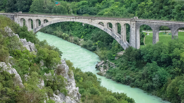 Auch ich „kämpfe“, und zwar den Berg hoch. Aber der Reihe nach. Ich bin im Ort Solkan (Söllingen) gestartet, einem Vorort von Nova Gorica (sprich: Nowa Goriza; Görz). Solkan liegt an dem für Slowenien sehr bekannten Fluss Soča (sprich: Sotscha; italienischer Name: Isonzo). Und eben über diese Soča führt nicht nur eine sehr hohe Verkehrsbrücke (sonntags mit Bungee-Jumping), sondern auch eine berühmte Eisenbahnbrücke, die Salcanobrücke. Sie gilt als die größte gemauerte Eisenbahn-Bogenbrücke der Welt und wurde 1905 fertiggestellt. Im 1. Weltkrieg wurde sie 1916 von rückziehenden österreichisch-ungarischen Pionieren gesprengt und 1925 – 1927 durch die italienische Staatsbahn wieder aufgebaut. Im 2. Weltkrieg kam sie 1945 mit nur einem Bombenloch in der Brückendecke davon. Und deshalb ist sie noch heute richtig schön anzusehen.