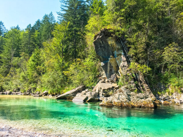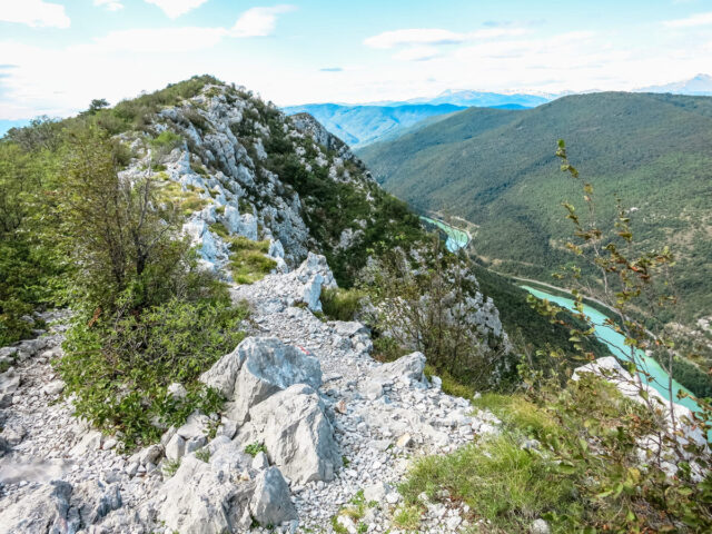 Zunächst suchte ich mir an Schrebergärten vorbei einen Pfad runter zur Soča. Am Fluss angekommen, entdeckte ich ein Schlauchboot mit einem Mann. Er wartete etwas versteckt am Ufer auf die Bungee-Jumper, die er nach dem Sprung aufnehmen sollte. Ich ging einen schönen schmalen Pfad weiter entlang des Flusses. Hier hat die Soča richtig türkises Wasser, ganz anders als im Norden in den höheren Bergen. Dort ist sie glasklar und schimmert wunderschön blau, mal hellblau, mal dunkelblau und auch mal dazwischen. Ich kam an eine Wildwasseranlage mit Restaurant und nett gelegener Terrasse. Das Kajak Center liegt gleich nebenan. Hier gibt es die Tickets für den Fun- und Kletterpark direkt gegenüber auf der anderen Flussseite. Ich hatte noch nichts Süßes für meine Tour und so lachten mich zwei Choco-Croissants im Café/Restaurant an. Die anschließende Fußgänger-/Radfahrbrücke ist ziemlich neu von 2020. Diese und die gewundene Rampe auf der anderen Seite wurden wahrscheinlich mit EU-Geldern angelegt. Entlang des Flusses führt ein gut angelegter Radweg.