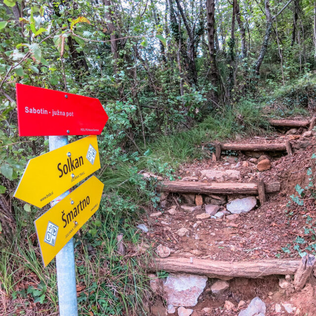 Ich war mit dem kostenlosen Bus aus dem südlichen Vorort Rozna Dolina ca. 20 Minuten nach Solkan unterwegs. In Rozna Dolina lag meine Pension. Ich wollte auf den Sabotin. Am Wendeplatz für den Bus gibt es einige aufgestellte Landkarten. U. a. eine Karte mit verschiedenen Wandertouren auf und über den Sabotin. Auf der Tourenkarte checkte ich nochmal die Route, die ich mir über OpenStreetMap ausgedacht hatte. Und los ging es.