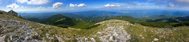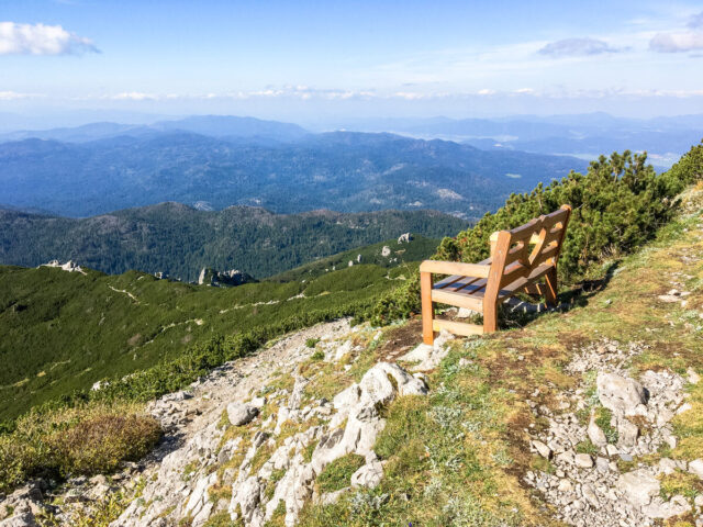 Die Rund-um-Sicht an diesem Tag vom Gipfel ist fantastisch, einfach grandios. Die angrenzenden kroatischen Berge sind zum Greifen nah. Der nur 45-minütige Aufstieg vom letzten Parkplatz hat sich absolut gelohnt. Ok, je nach Belieben können auch weitere Strecken mit herrlichem Waldanteil hinauf gewandert werden. Für mich war organisatorisch diese Variante die Beste.