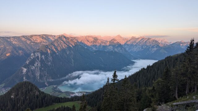 Wir erkundeten die Umgebung mit einer Wanderung auf den Geschöllkopf (2039 m). Der Aufstieg stellte eine willkommene Herausforderung dar, die wir mit großem Enthusiasmus meisterten. Die Belohnung für unsere Mühen war ein atemberaubender Ausblick über die umliegenden Gipfel und das glitzernde Wasser des Achensees.