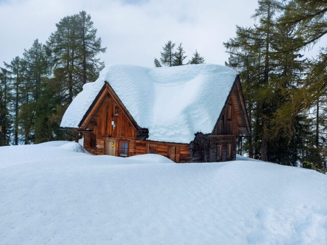 Am nächsten Morgen also los, Schneeschuhe ausleihen, an der Mautstelle bezahlen und rauf auf die Alm. Oben dann – der Parkplatz ist frei geräumt, aber einige Autos sind vom Schnee bedeckt.