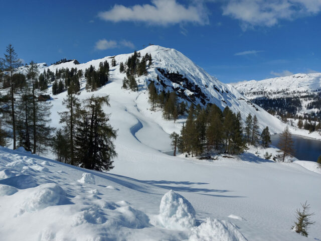 Wir versuchten den gleichen Weg zu wählen, den wir eine Woche vorher auf dem Weg zum Klettersteig auch gegangen sind. Aber der ist jetzt unter anderthalb bis zwei Meter Schnee verborgen. Trotzdem konnten wir uns gut an den Bäumen und der Topografie orientieren.