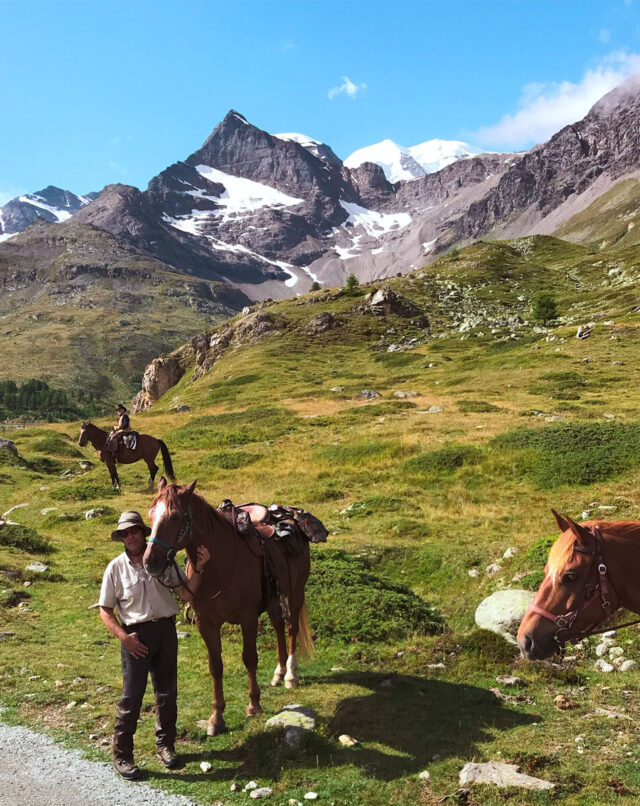 Die steilen Serpentinen hinter den beiden alten Torri di Fraéle aus dem 14. Jahrhundert, Wachtürme an der „Via Imperiale d'Alemagna", (einer der Hauptverbindungen für den Handelsverkehr zwischen Bormio und dem Engadin,) sind angeblich bei Motorradfahrern und ehrgeizigen Radlern sehr angesagt. Zum Glück ist aber an diesem Morgen wenig Verkehr, nach wenigen Kehren verlassen wir schon wieder die Passstraße und reiten auf halber Höhe, immer auf ca. 1.800 m durch den Bergwald in Richtung Südwesten ins Val Viola Bormina. Auch die Wetterprognose für den dritten Tag ist bestens – und geht sogar in Erfüllung! So wird der Ritt zur Alpe Dosdè und weiter zum Pass da Val Viola zum eigentlichen Höhepunkt der gesamten Tour. Nicht nur, dass dieser Pass mit seinen 2.468 m sogar 140 m höher als der Berninapass ist, nein, der Blick auf den Gipfelkranz rund um den Corno di Dosdè und dann vom Joch aus zum Piz Palü in der Ferne ist schon grandios. Und wir haben, ohne es so recht wahrzunehmen, auch die Grenze zurück in die Schweiz überschritten. Anders als im noch relativ unberührten Val Viola herrscht hier im Schweizer Val da Camp reger Betrieb. Unzählige Ferienhäuser säumen rechts und links den Weg und neben der Saoseo-Hütte des SAC ist eine große Baustelle. Wir reiten weiter bis nach Sfazù. Hier bleiben wir jetzt zwei Nächte, so dass sich die Pferde etwas erholen können. Wir nutzen den freien Tag für einen Ausflug mit dem Posti und der Kleinen Roten (Berninabahn) zu den Gletschermühlen von Cavaglia und auf die Alp Grüm: ein fantastischer Blick von der Belvedere-Terrasse auf den leider inzwischen recht schmächtigen Palü-Gletscher und in die Valposchiavo.