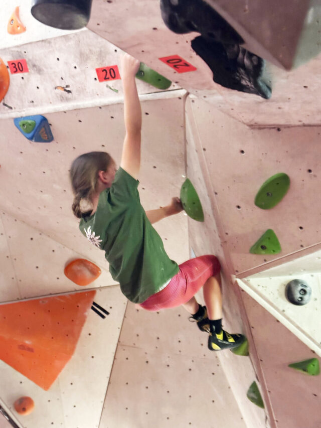 Nachdem in einer Ecke das Basecamp aus Rucksäcken und Keksdosen errichtet wurde, begannen alle auszuschwärmen und sich die Boulder anzuschauen. In der Vorbesprechung erfuhren wir, dass dies der bisher teilnehmerstärkste Kidscup überhaupt ist – nichtsdestotrotz hat dank der guten Organisation und Zusammenarbeit zwischen den Schiedsrichtern, ehrenamtlichen Helfern und dem Team des Canyon Chorweiler alles reibungslos funktioniert.