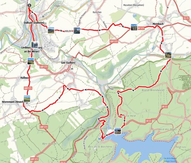 Vom Bahnhof in Dolhain geht es anfangs über feste Wege und später über Wiesen nach Membach. In Membach überqueren wir die Weser und steigen durch einen Wald anfangs sanft, später steiler zur Staumauer der Gillepetalsperre auf. Diese überqueren wir und wandern hinunter zum Wald von Borchêne. Wir überqueren den Bach an der Staustufe und gehen an einem Betonwerk vorbei bis wir zu einem Aquädukt kommen. Diesem folgen wir bis zu den Ausläufern von Goè. Am Arboretum von Coingsoux biegen wir nach links ab und folgen dem Weg bis oberhalb von Hèvremont. Über Wiesen geht es hinunter zum Ort, um von dort den letzten Anstieg zum historischen Limbourg zu machen. Von dort ist es dann über Straßen durch Dolhain zu unserem Startpunkt nicht mehr weit.